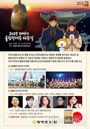 코리아타임뉴스 이아름 기자 | 평창문화원은 다가오는 12월 31일 22시 30분부터 2025년 을사년을 마무리하고 희망찬 2026년 병오년 새해를 기원하는 2025년 제야의 올림픽대종 타종행사를 개최한다.