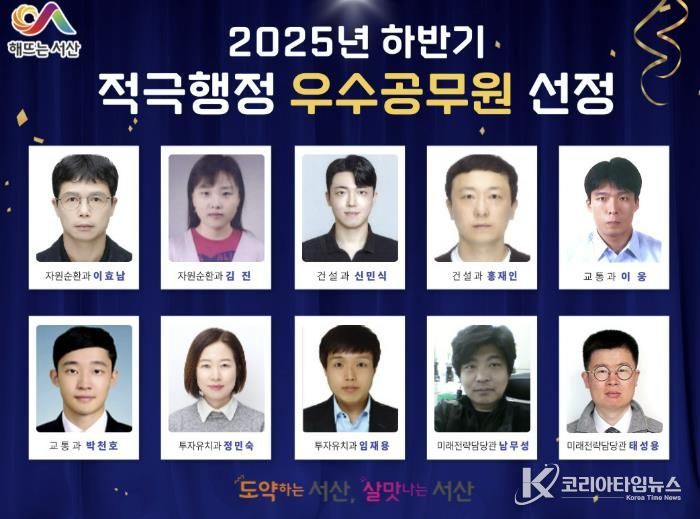 코리아타임뉴스 김택호 기자 | 충남 서산시는 2025년 하반기 적극행정 우수사례 5건과 이를 추진한 우수공무원 10명을 선정했다고 밝혔다.