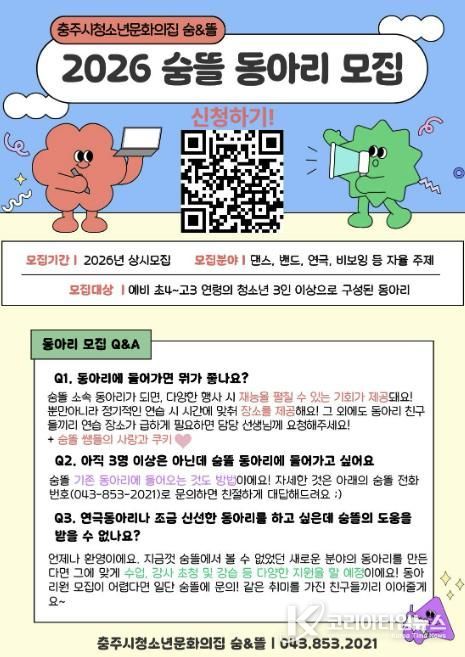 코리아타임뉴스 박찬식 기자 | 충주시청소년문화의집 숨&뜰은 2026년 한 해 동안 청소년들의 자율적인 문화 활동을 지원하기 위해 청소년 동아리를 상시 모집한다고 밝혔다.