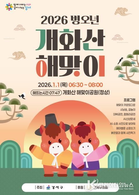 코리아타임뉴스 노승선 기자 | 서울 강서구는 2026년 1월 1일 병오(丙午)년 붉은 말의 해를 맞아 개화산 정상(금낭화로17길 213)에서 ‘2026 개화산 해맞이 행사’를 개최한다.