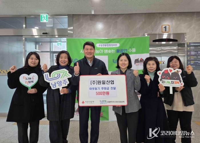 코리아타임뉴스 경기취재본부 | 남양주시는 29일 수동면 소재 ㈜원일산업에서 지역 내 어려운 이웃을 위한 후원금 500만 원을 경기사회복지공동모금회를 통해 수동면 지역사회보장협의체에 지정 기탁했다고 밝혔다.