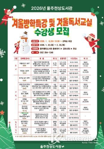 코리아타임뉴스 울산취재본부 | 울주천상도서관이 다음달 20일부터 내년 2월 26일까지 겨울방학을 맞아 겨울방학특강 및 겨울독서교실을 운영한다고 30일 밝혔다.
