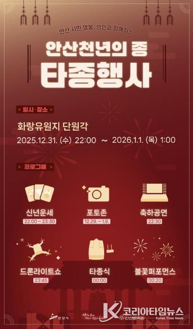 코리아타임뉴스 기동취재팀 | 안산시는 오는 31일 오후 10시부터 화랑유원지 단원각에서 ‘2026 안산 천년의 종 타종 행사’를 개최한다고 30일 밝혔다.