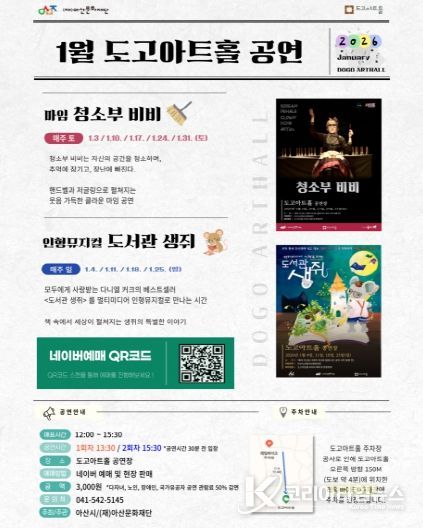 코리아타임뉴스 김택호 기자 | 아산문화재단(대표이사 유성녀)이 운영하는 도고아트홀이 2026년 1월, 주말 상시 공연과 전시를 통해 새해 시민들의 문화 일상화를 이어간다. 이번 프로그램은 가족 단위 관람객과 어린이를 중심으로 공연과 전시를 함께 즐길 수 있도록 구성돼 있어, 새해 첫 달부터 풍성한 문화 향유 기회를 제공한다.