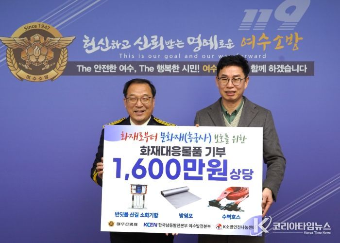 코리아타임뉴스 김태훈 기자 | 여수소방서는 겨울철 화재 위험 증가에 대비해 추진 중인 겨울철 자율특수시책의 일환으로, 한국남동발전 여수발전본부로부터 1,600만 원 상당의 화재안전물품을 기부받았다고 밝혔다.