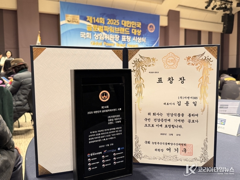 코리아타임뉴스 김태훈 기자 | 지앤지365 김용일 대표가 지난 23일 한국프레스센터서 한국시사경제, 코리아타임뉴스(윤광희 회장)주최로 열린 2025 대한민국 글로벌파워브랜드 대상(GPBA) 시상식에서 국회 농림축산식품해양수산위원장 표창을 수상했다. 회사는 이번 수상이 건강식품 분야에서 천연 원료 기반의 제품 혁신과 유통 경쟁력을 인정받은 결과라고 밝혔다.