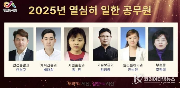 코리아타임뉴스 김택호 기자 | 충남 서산시는 올해 시정 발전과 시민 삶의 질 향상을 위해 노력한 공무원 6명을 ‘열심히 일한 공무원’으로 선정했다고 밝혔다.