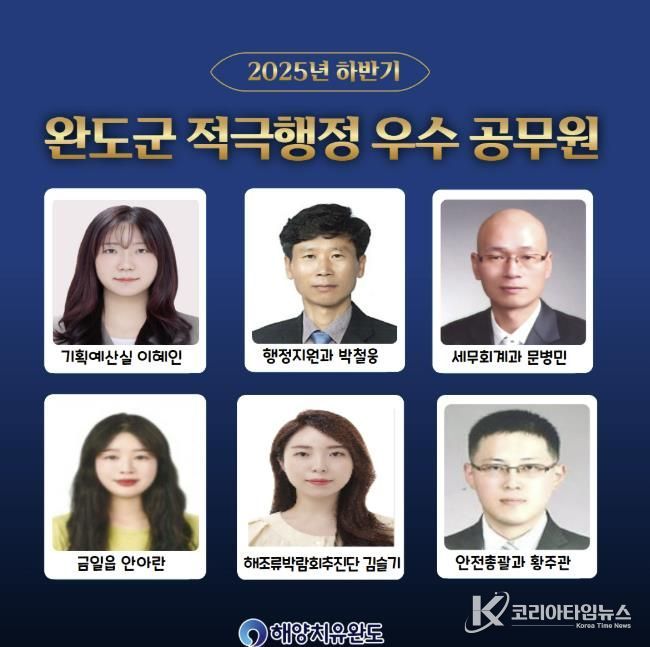 코리아타임뉴스 노승선 기자 | 완도군은 지난 24일 적극행정위원회를 개최하고 ‘2025년도 하반기 적극 행정 우수 공무원’ 4명과 협업팀 2팀을 선정했다.