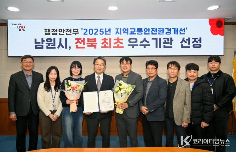 코리아타임뉴스 김태훈 기자 | 남원시가 행정안전부 주관 ‘2025년 지역교통안전환경개선’ 평가에서 전국 우수 지자체로 선정되어 행정안전부 장관 표창을 수상했다.