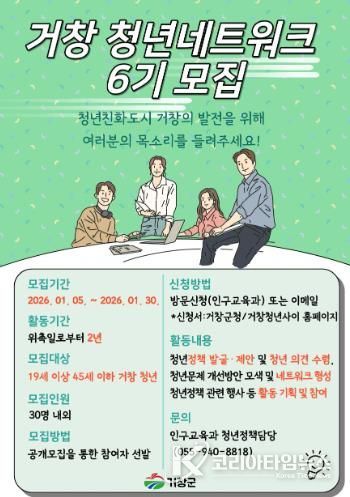 코리아타임뉴스 오영주 기자 | 거창군은 제6기 거창군 청년네트워크 활동가를 오는 5일부터 30일까지 모집한다.