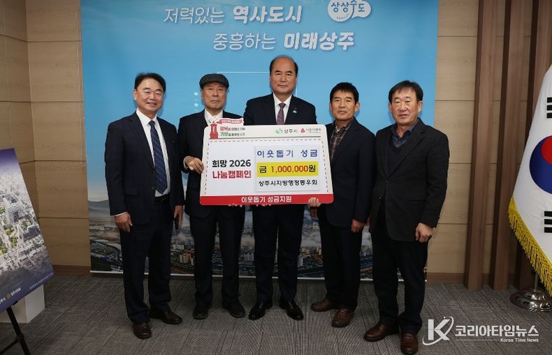 코리아타임뉴스 노승선 기자 | 상주시지방행정동우회(회장 차영덕)은 2일 상주시청 시민의 방을 방문하여 희망2026 나눔캠페인 성금 100만원을 기탁했다.