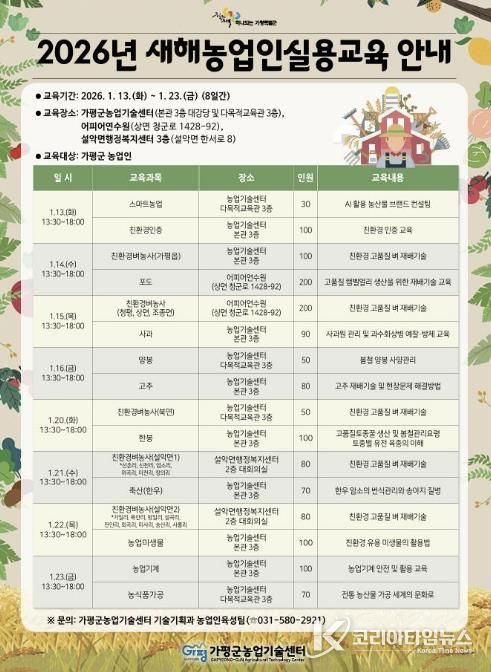 코리아타임뉴스 기동취재팀 | 가평군농업기술센터가 농업인의 영농 역량 강화를 위해 ‘2026년 새해농업인실용교육’을 오는 1월 13일부터 23일까지 실시한다.