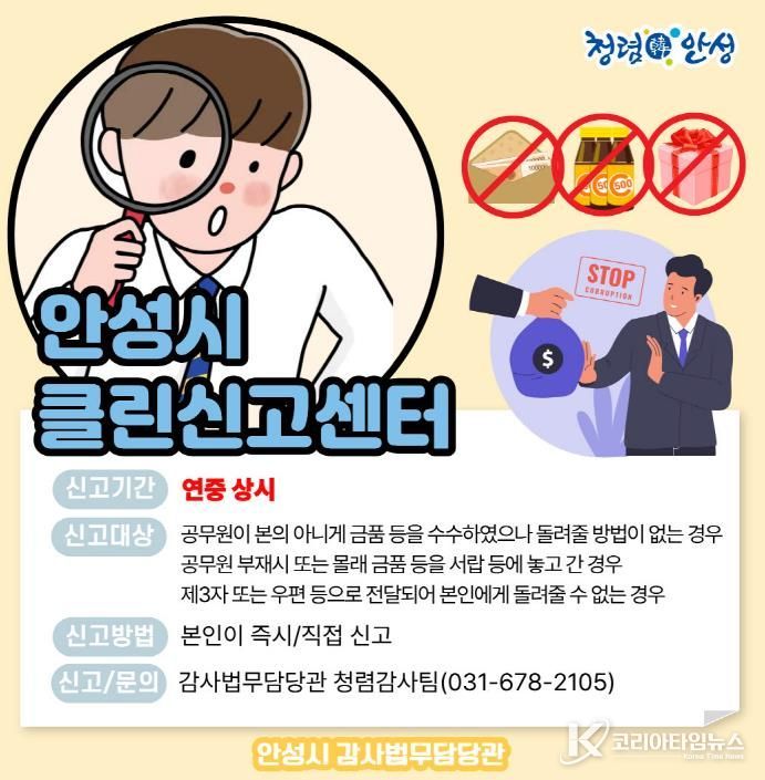 코리아타임뉴스 경기취재본부 | 안성시는 시민들에게 신뢰받는 공정하고 투명한 행정 서비스를 제공하기 위해 ‘클린신고센터’를 연중 상시운영하며 청렴한 행정문화 정착에 힘쓰고 있다고 밝혔다.