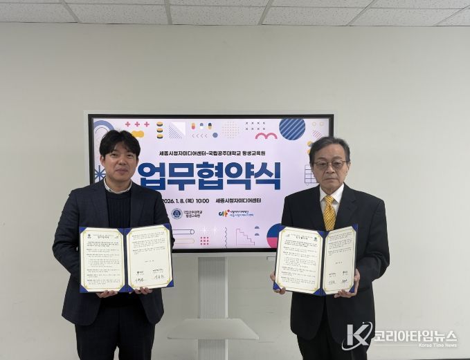 코리아타임뉴스 세종취재분부 | 시청자미디어재단 세종시청자미디어센터와 국립공주대학교 평생교육원은 1월 8일 오전 10시, 세종시청자미디어센터에서 시민의 미디어 이해력 및 활용 역량 강화를 위한 업무협약(MOU)을 체결했다.