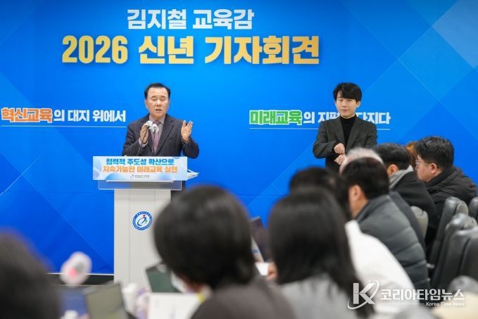 코리아타임뉴스 사회팀 | 김지철 충남교육감은 8일, 도교육청 회의실에서 ‘2026 신년 기자회견’을 열고, ‘2025년 주요 성과와 2026년 12대 중점 추진 과제’를 발표했다.