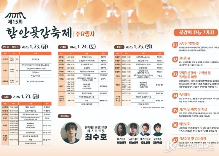 코리아타임뉴스 오영주 기자 | 함안군은 함안곶감축제위원회(위원장 임영오, 사무국장 이진혁)가 주관하는 제15회 함안곶감축제가 오는 23일부터 25일까지 함안체육관 일원에서 개최된다고 지난 9일 밝혔다.