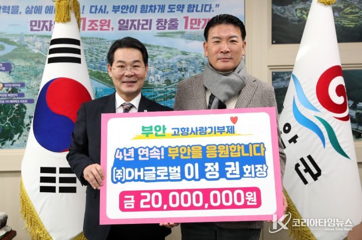코리아타임뉴스 전북취재본부 | 부안군은 ㈜DH글로벌 이정권 회장이 고향사랑기부제에 4년 연속 고액기부를 실천하며 지역을 향한 꾸준한 나눔을 이어가고 있다고 밝혔다.