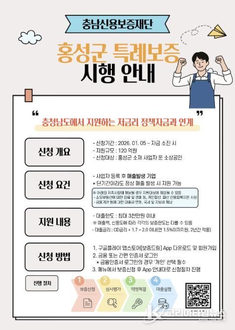 코리아타임뉴스 충남취재본부 | 홍성군은 경기 둔화와 고금리·고물가 상황이 지속됨에 따라 자금 조달과 경영 운영에 어려움을 겪고 있는 관내 소상공인의 금융 부담을 완화하고자 ‘2026년 소상공인 특례보증 지원사업’을 시행한다고 밝혔다.
