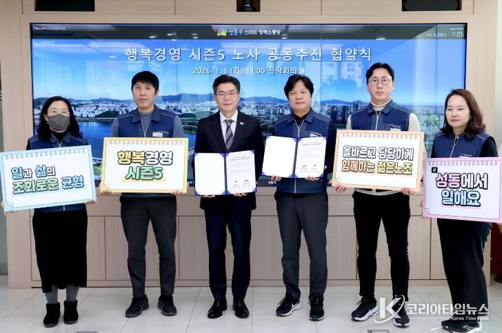 구는 올해도 직원들이 체감할 수 있는 후생 복지와 근무 환경 개선 사업을 확대 추진하기 위해 지난 6일 전국공무원노동조합 서울지역본부 성동구지부와 함께 '행복경영 시즌5' 노사 공동추진 협약식을 개최했다.