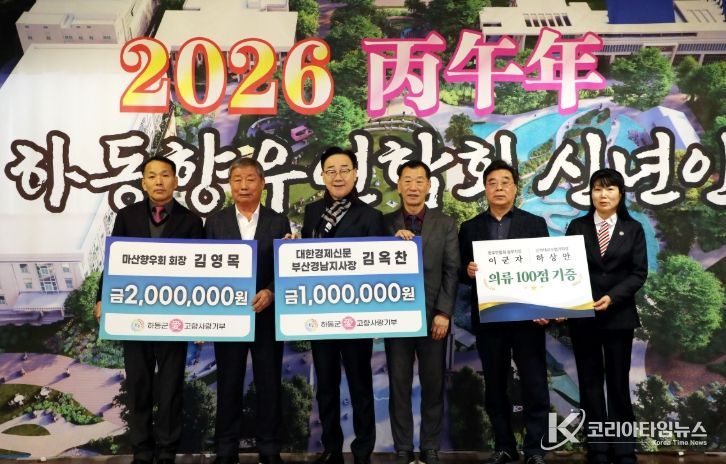 코리아타임뉴스 오영주 기자 | 하동군은 지난 9일 개최된 ‘전국하동향우연합회 2026년 신년인사회’에서 김영목 마산향우회장과 김옥찬 대한경제신문 부산·경남 지사장이 각각 고향사랑기부금 200만 원, 100만 원을 전달했다고 밝혔다.