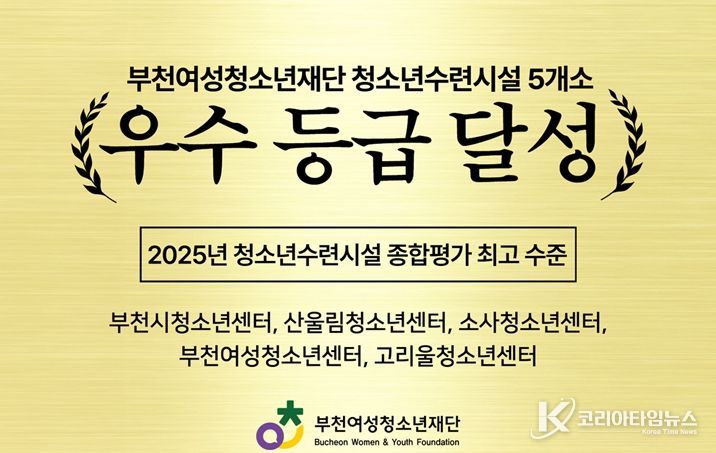 코리아타임뉴스 경기취재본부 | 부천여성청소년재단이 청소년수련시설 5개소(부천시청소년센터, 산울림청소년센터, 소사청소년센터, 부천여성청소년센터, 고리울청소년센터)가 성평등가족부 주관 2025년 청소년수련시설 종합평가에서 5개 시설 모두 최고 수준인 ‘우수’ 등급을 달성하는 쾌거를 이루었다.