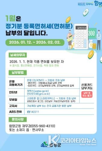 코리아타임뉴스 오영주 기자 | 함양군은 올해 1월 정기분 등록면허세(면허) 8,686건, 1억 1,500만 원을 부과하고 2월 2일까지 납부할 수 있도록 적극적인 홍보에 나섰다.
