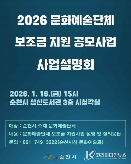 코리아타임뉴스 전남취재본부 | 순천시는 오는 16일 오후 3시, 삼산도서관 3층 시청각실에서 순천시 문화예술단체를 대상으로 ‘2026년 순천시 문화예술단체 보조금 지원사업 설명회’를 개최한다고 밝혔다.
