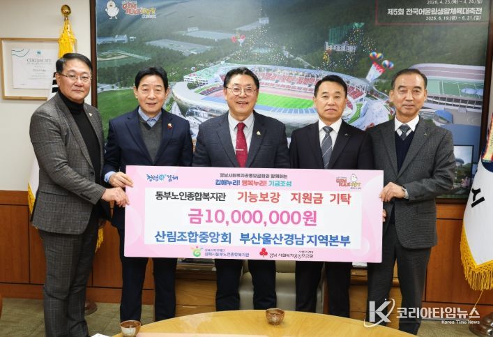 코리아타임뉴스 오영주 기자 | (재)김해시복지재단 김해시동부노인종합복지관(관장 심우영)에서는 지난 12일 산림조합중앙회 부산울산경남지역본부 시설보수 기능보강 지정기탁 금1,000만원 전달식을 개최했다.