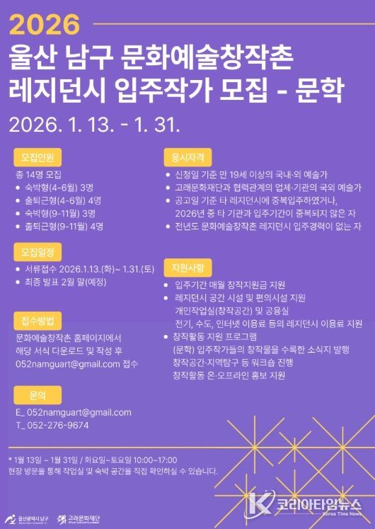 코리아타임뉴스 울산취재본부 | 고래문화재단이 운영하는 울산 남구 문화예술창작촌이 2026년도 레지던시 사업에 참여할 입주작가를 1월 13일부터 1월 31일까지 공개 모집한다.