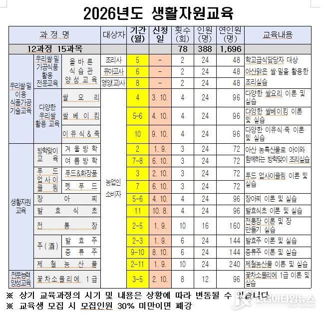 이미용 농촌자원과장은 “올해 생활자원교육은 단순한 실습을 넘어 시민의 삶에 실질적인 도움이 되는 교육이 되도록 계획했다”며, “다양한 교육과정을 통해 많은 시민들이 농촌자원의 가치를 체감하길 바란다”고 말했다.