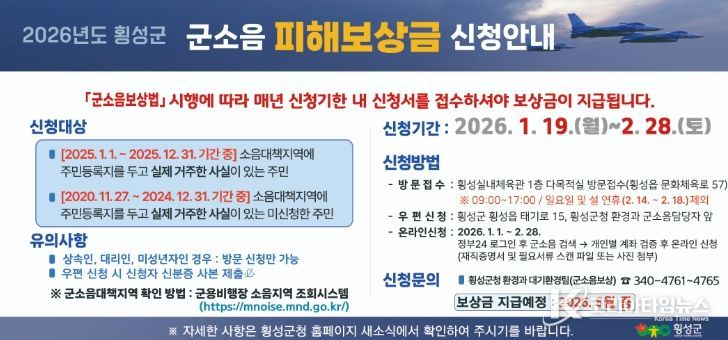 코리아타임뉴스 이아름 기자 | 횡성군은 오는 19일부터 내달 28일까지 ‘2026년 군용기 소음피해 보상금’ 신청을 접수한다고 밝혔다.