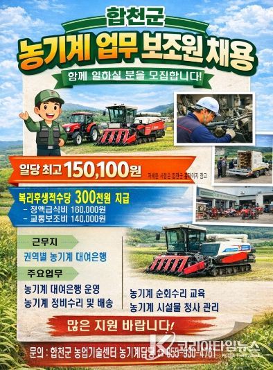 코리아타임뉴스 경남취재본부 | 합천군은 농기계대여은행 운영체계를 강화하고 농업인 영농 편의를 높이기 위해 2026년 농기계 업무보조원 기간제근로자 9명을 채용한다고 14일 밝혔다.