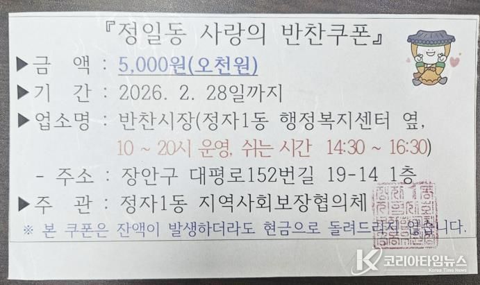 코리아타임뉴스 사회팀 | 수원시 장안구 정자1동 지역사회보장협의체는 금년부터 관내 취약계층 가구를 대상으로 매월 5가구에 2만원 상당의 반찬쿠폰을 지급하는 사업을 시작한다고 지난 13일 밝혔다.