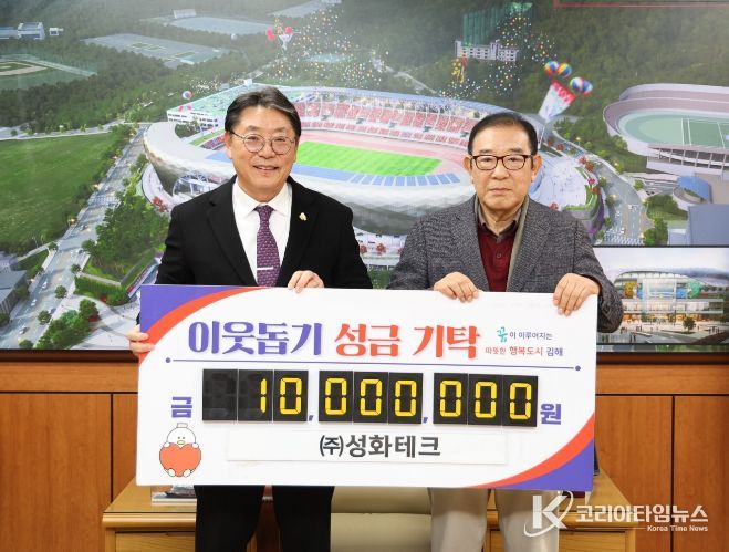 홍태용 김해시장은 “이웃을 위해 따뜻한 나눔을 실천해주신 ㈜성화테크에 진심으로 감사드린다”며 “기탁해주신 성금은 꼭 필요한 곳에 소중히 전달하겠다”고 밝혔다.