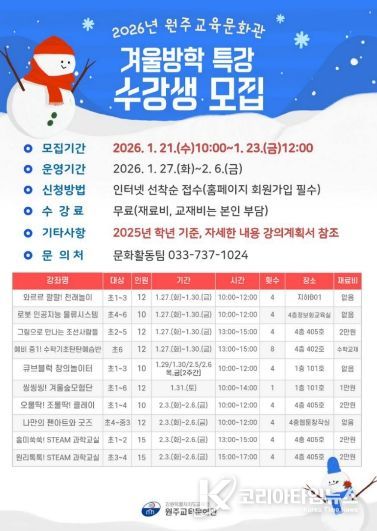 코리아타임뉴스 사회팀 | 원주교육문화관(관장 용석태)은 1월 21일부터 23일까지 관내 초·중학생을 대상으로 겨울방학 특강 수강생을 모집한다.