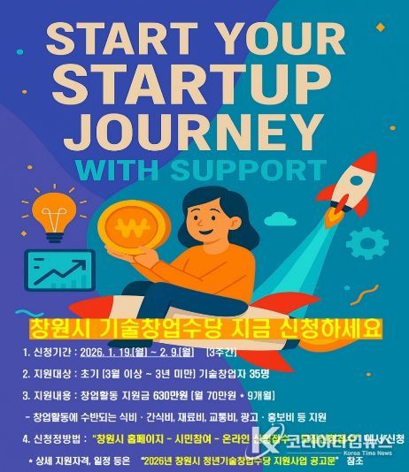 코리아타임뉴스 오영주 기자 | 창원특례시는 1월 19일부터 2월 9일까지 ‘2026년 청년기술창업수당 지원사업’ 참여자 35명을 모집한다고 밝혔다.