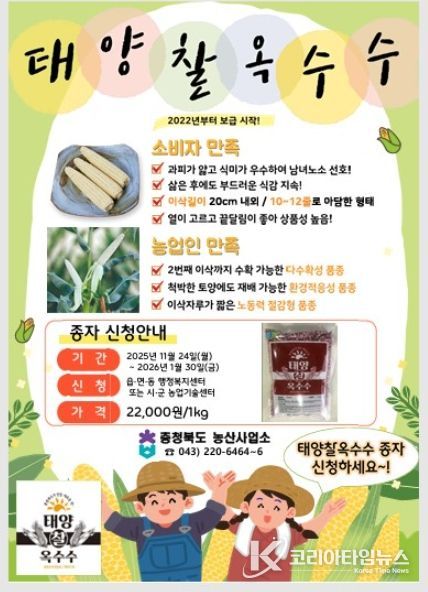 코리아타임뉴스 충북취재본부 | 옥천군농업기술센터는 지역 농가의 소득 증대와 안정적인 옥수수 생산을 지원하기 위해 태양찰옥수수 종자 신청 접수를 받고 있다.