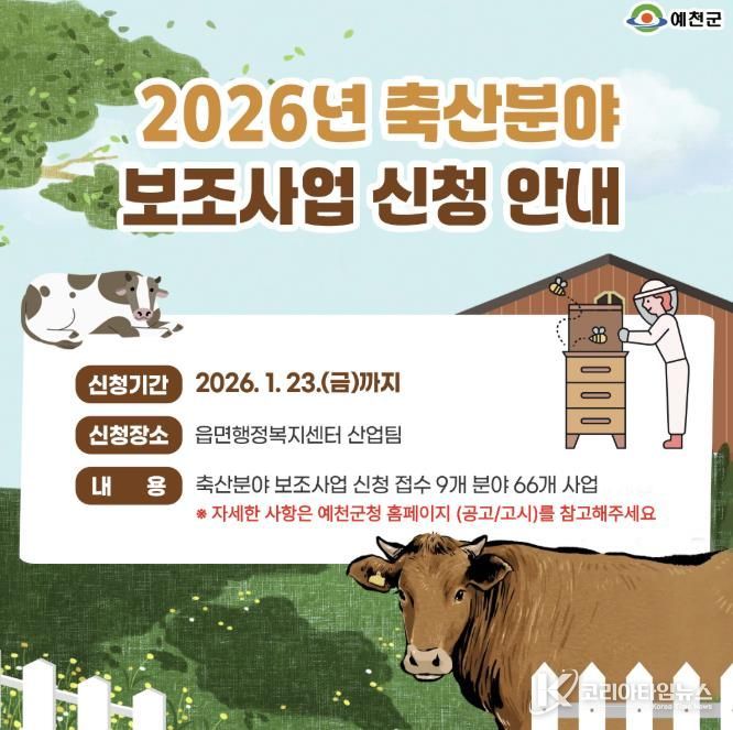 코리아타임뉴스 경북취재본부 | 예천군은 2026년도 축산 7개 분야 66여 개의 보조사업에 대해 23일까지 읍‧면 행정복지센터에서 신청을 받는다고 밝혔다.