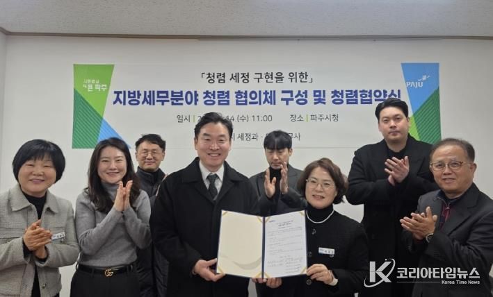 코리아타임뉴스 윤광희 기자 | 파주시는 지난 14일 파주지역세무사회(마을세무사)와 함께 청렴 문화의 정착과 확산을 위한 민관 청렴협의체를 구성하고, 청렴 실천을 위한 협약을 체결했다고 밝혔다.