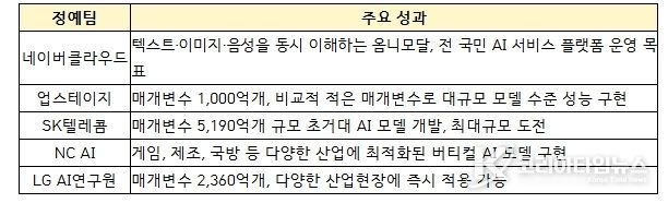 `25년 8월부터 「독자 AI 파운데이션 모델 프로젝트」 정예팀에 선발된 5개 팀이 치열한 경쟁을 통해 기술 혁신을 거듭한 결과, 정예팀이 개발한 AI 파운데이션 모델(`25년말 공개) 5개 모두 미국 비영리 AI연구기관 ‘Epoch AI’의 ‘주목할만한 AI모델(Notable AI Models)’로 등재되는 성과를 거두었다.