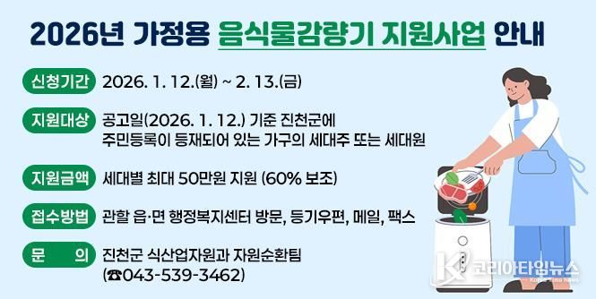 송현아 군 식산업자원과 주무관은 “가구당 연간 음식물쓰레기 발생량을 지속적으로 줄이는 데 음식물 감량기 지원 사업이 제 역할을 할 것으로 기대한다”며 “앞으로도 자원 순환형 생활문화가 더욱 확산할 수 있도록 최선을 다하겠다”고 말했다.