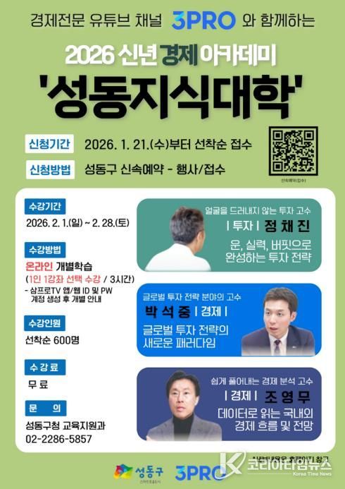 코리아타임뉴스 오영주 기자 | 서울 성동구는 새해를 맞아 투자, 경제 분야 전문 온라인 강좌를 무료로 들을 수 있는 신년 경제 아카데미 ‘성동지식대학’을 운영한다고 밝혔다.