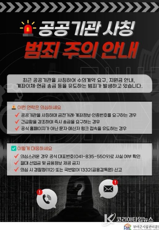 코리아타임뉴스 충남취재본부 | 부여군시설관리공단은 최근 공공기관을 사칭해 물품 대리구매나 수의계약을 가장하고 선입금을 요구하는 사기 시도가 발생하고 있다며, 관내 업체와 협력사를 대상으로 각별한 주의를 당부했다.