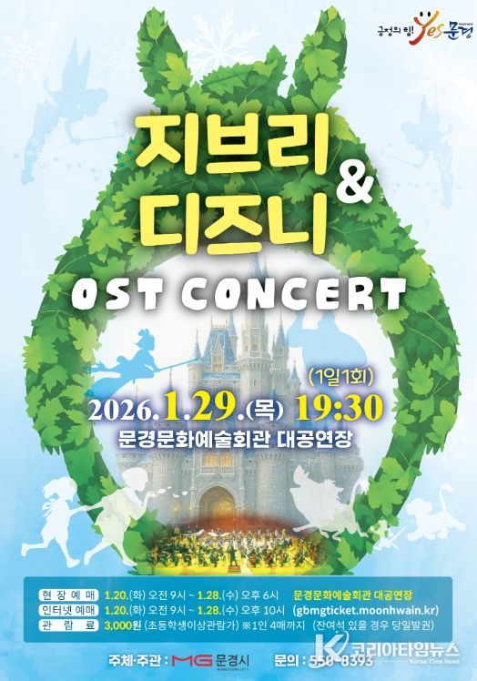 코리아타임뉴스 노승선 기자 | 문경문화예술회관에서는 신년 겨울 방학을 맞아 인기 애니메이션 대표곡들을 들려주는 지브리 ·디즈니 OST 콘서트 공연을 1월 29일 19:30 (1일 1회)에 문경문화예술회관 대공연장에서 개최한다.