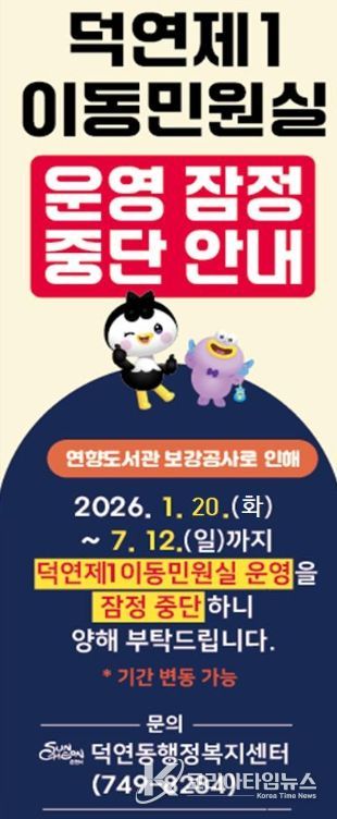 코리아타임뉴스 전남취재본부 | 순천시 덕연동행정복지센터는 연향도서관 내에 운영 중인 덕연동 제1이동민원실이 도서관 내진성능 보강공사 시행에 따라 오는 1월 20일부터 7월 12일까지 운영을 잠정 중단한다고 밝혔다.
