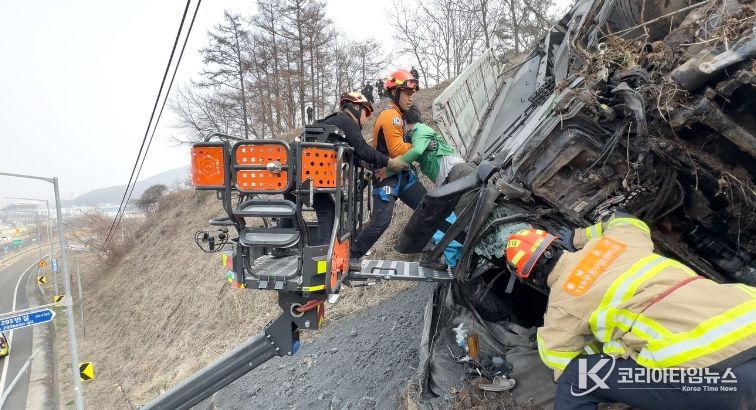 이번 사고는 석탄재를 적재한 덤프트럭이 가드레일을 출동한 뒤 전복된 것으로 확인됐으며, 신고 접수 직후 홍성소방서는 즉시 현장 출동을 했다.