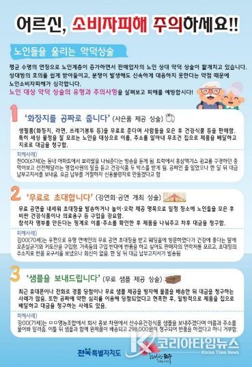 코리아타임뉴스 김태훈 기자 | 최근 생필품 염가 판매나 무료 사은품 제공을 앞세워 소비자를 유인한 뒤 고가의 건강보조식품이나 전자제품 등을 판매하는 사례가 늘고 있는 가운데, 전주시가 피해 예방을 위해 주의해 줄 것을 당부했다.