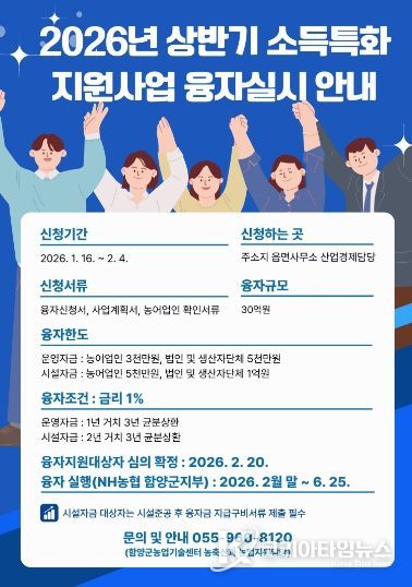 코리아타임뉴스 오영주 기자 | 함양군은 농업인의 경영개선과 농업 경쟁력 강화를 위한 ‘2026년 상반기 소득특화지원사업’을 시행하고, 오는 2월 4일까지 융자신청을 받는다.