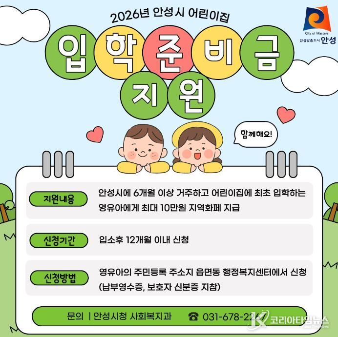 코리아타임뉴스 경기취재본부 | 안성시는 2026년부터 어린이집 입학준비금 지원사업을 시행한다고 밝혔다.