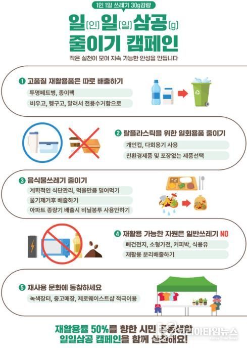 코리아타임뉴스 경기취재본부 | 안성시는 시민의 자발적인 실천을 통해 재활용률을 높이고 생활쓰레기 발생량을 줄이기 위한 ‘1인 1일 쓰레기 30그램 줄이기(일일삼공) 캠페인’을 적극 추진하고 있다고 밝혔다.